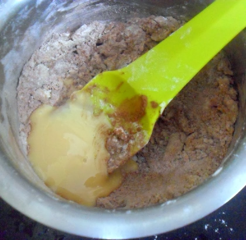 Next add the cocoa, condensed milk, curds and mix well. Now add the flour, salt, essence and finally the baking powder. Gently blend well.