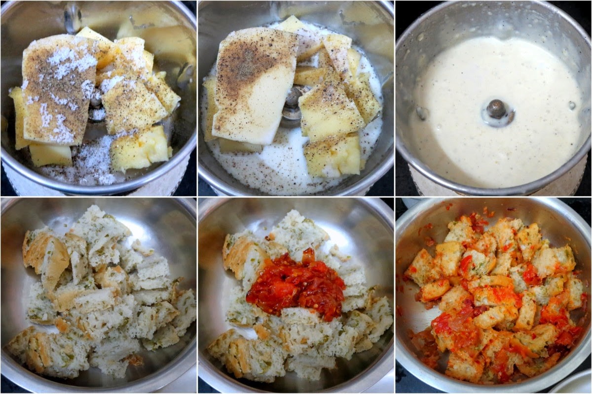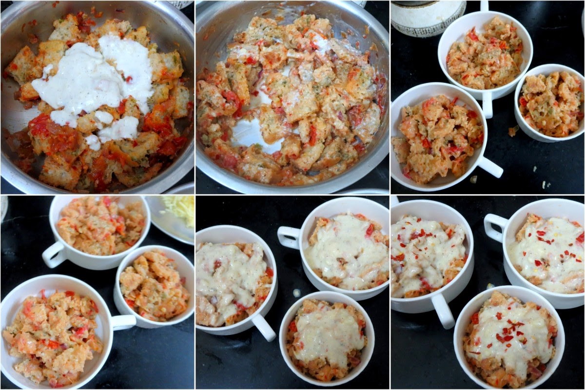 • Roughly chop the bread into tiny pieces. Add the spicy sauce and mix well. Add more milk as required. Save some cheese sauce for topping and add rest of the cheese sauce to the bread and combine.