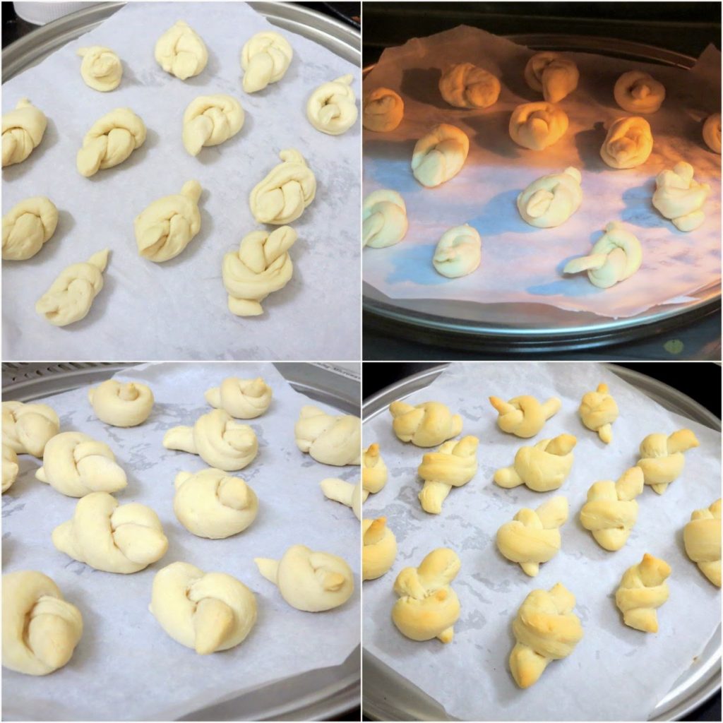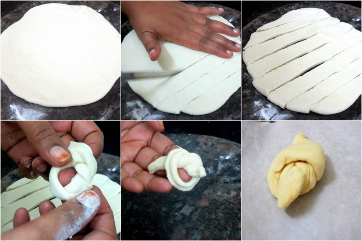 Take one strip, roll it into a rope of 7-8 inches long. Using your fingers, make a circle, insert one end inside to make a knot and close. Continue with all the rest. Place each on a parchment laid baking tray.