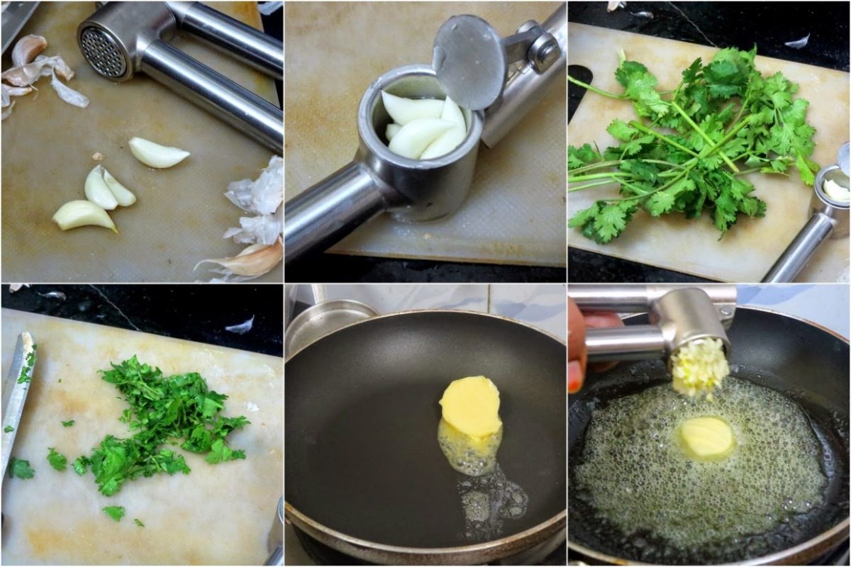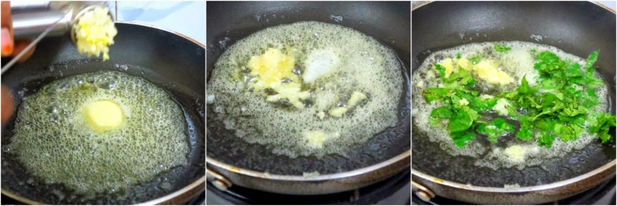 I used the garlic presser, which gets best results. Heat a non stick pan with butter, crush the garlic directly into it, add finely chopped coriander. Saute well for the spices to get mixed well. Switch off, and let it rest.