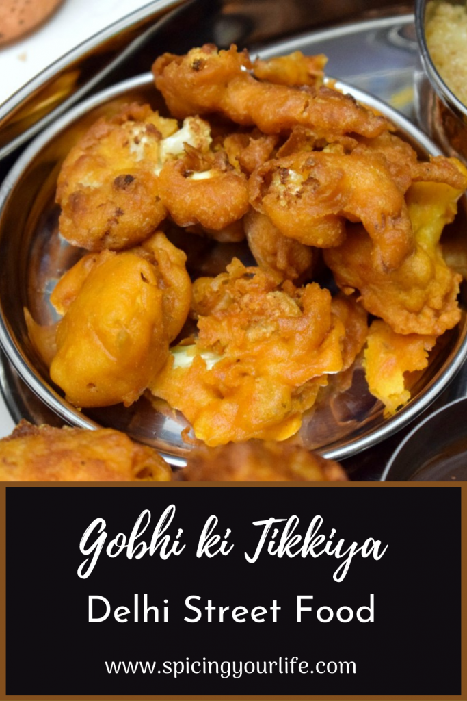 Gobhi Ki Tikiya is a cauliflower fritter or pakora, double-fried to make it very crispy. They serve this Delhi Street Food with spicy chutney.
