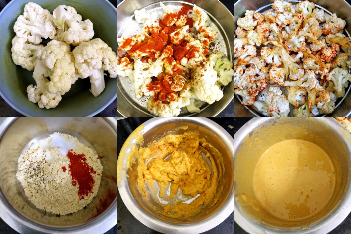 When the oil is hot enough, drop a few cauliflower florets into the prepared batter, coat them well.
