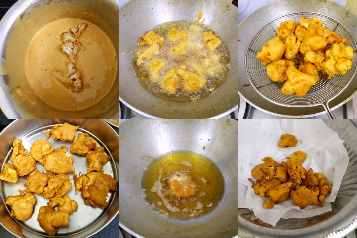 • When the oil is hot enough, drop a few cauliflower florets into the prepared batter, coat them well.