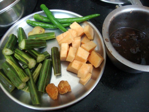 Chop the Drumsticks, Yam, have the Jaggary, Green Chilies, Ginger ready.