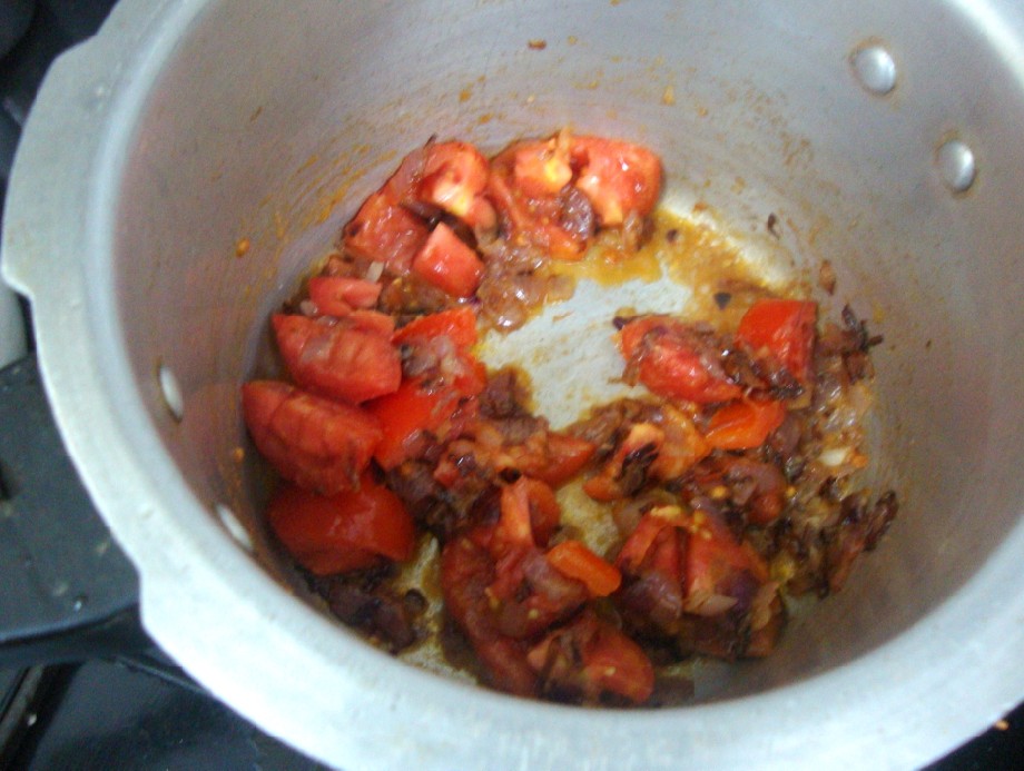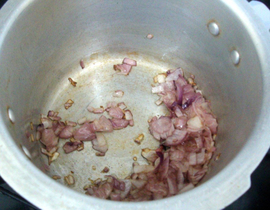 Heat a pressure cooker, add oil saute finely chopped onions till they turn light brown.