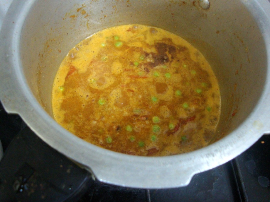 Adjust masala, add water, and cover with lid and pressure cook for 2 whistles.