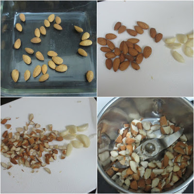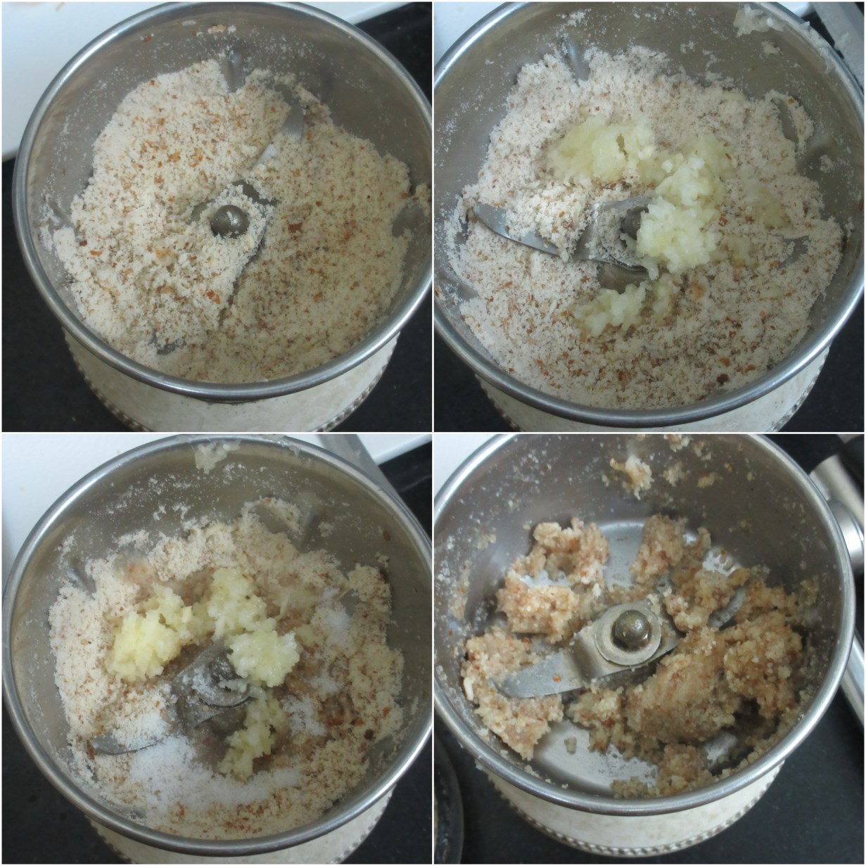 MW almonds for a minute, then chop it finely, and grind to a fine powder. Add crushed garlic and pulse it. Add olive oil and pulse again.