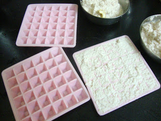 I have already posted on Coconut paste which is always stored for making gravies. However as a ground coconut stored in the fridge will not be fresh. If the coconut is ground without adding any water and not touched, it mostly stays for a week or otherwise the shelf life is only about 2 -3 days. After seeing that so many coconuts are going wasted, plus the fact that in the rush hour it becomes extremely tough to grind, we thought we should freeze it in cubes for easy usage.