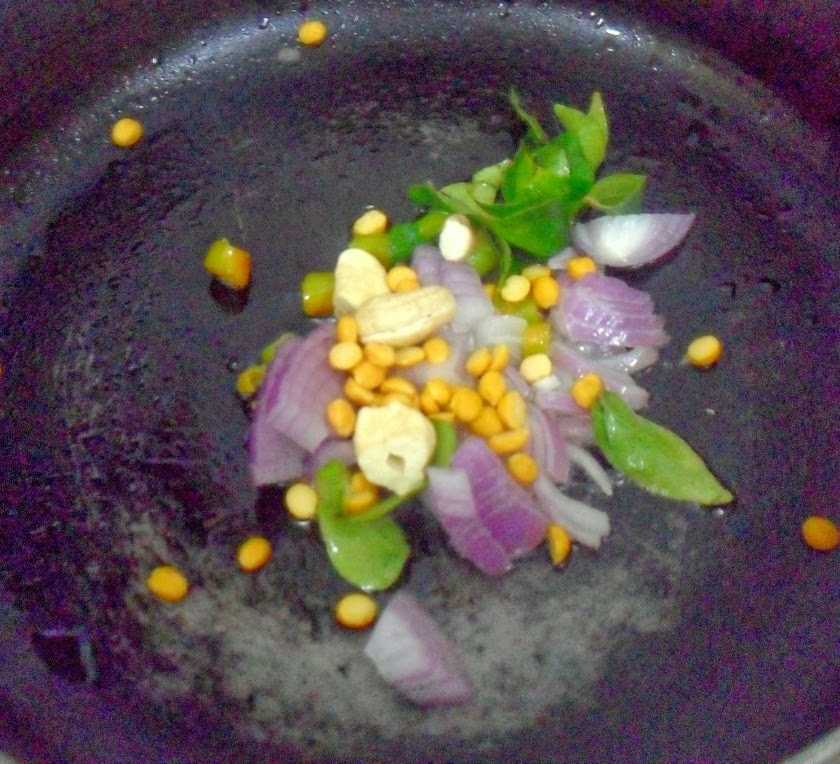 In the same pan, add oil heat and add the onions, curry leaves, green chilies, chana dal, cashew nuts. Roast well.