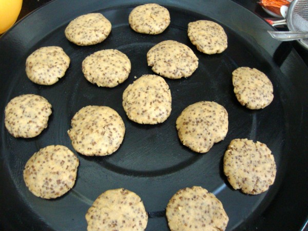 Then slowly add the butter to the flour and knead to a dough. Depending on how it forms a ball, add milk. Mine was fine without adding any milk. Pinch out small balls, press into small discs. Press the jeera on the top.