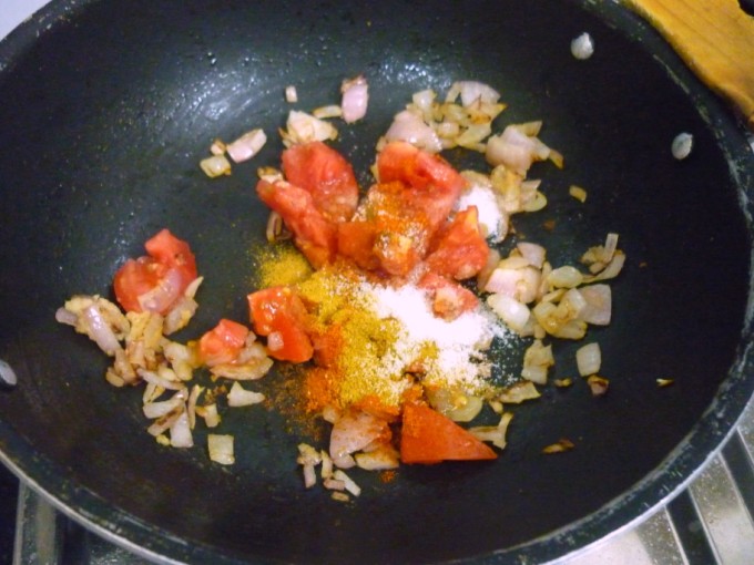 Then add tomatoes, all the spice powders. Simmer for a while. Finally, add kala namak Simmer for a couple of minutes.
