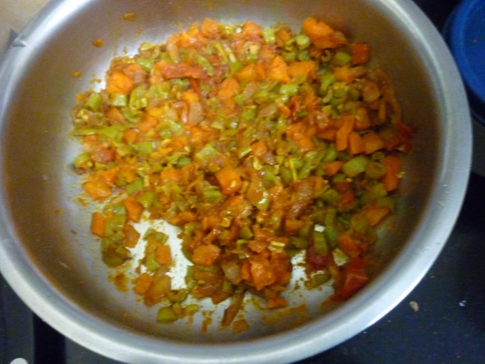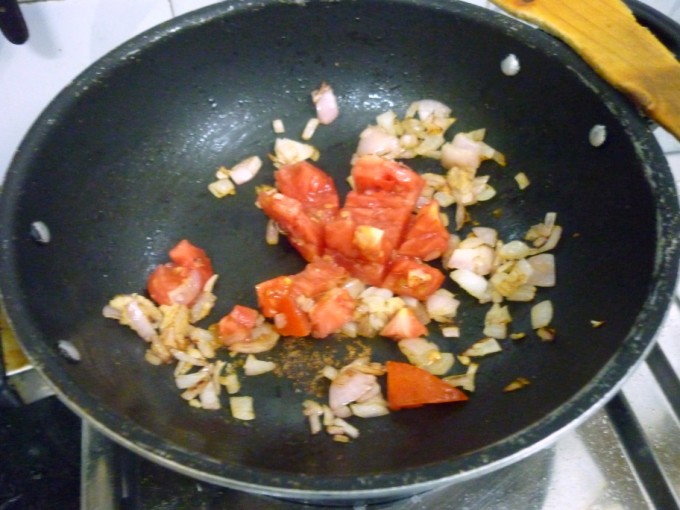 Heat a pan with oil, saute onions, when it turns brown add ginger garlic paste. Fry for a couple of minutes.