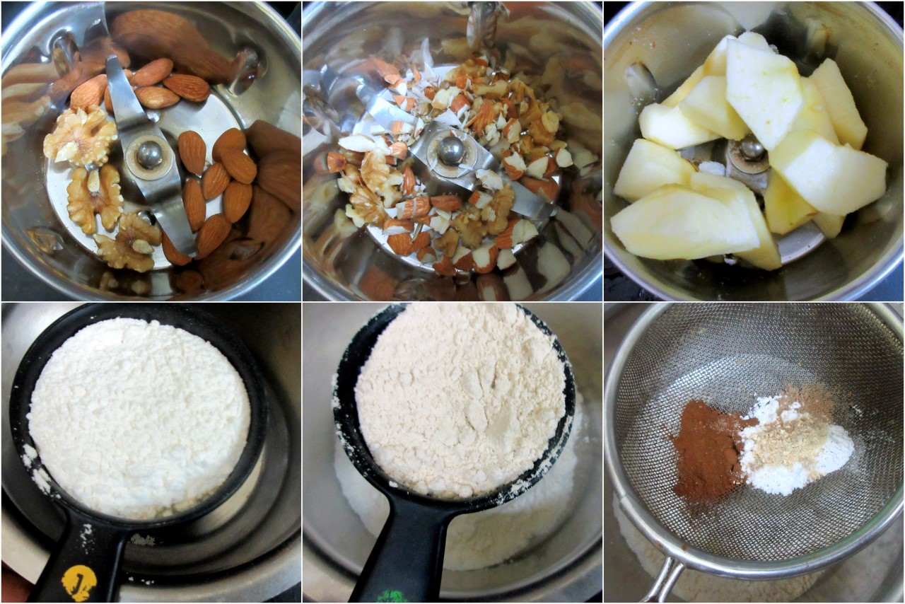 - In a bowl, mix the flours, ground almonds, walnuts, baking powder, baking soda, and spices.