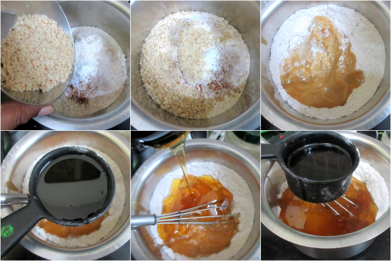 - Next add the apple puree, honey, oil and egg replacer mix along with brown sugar.