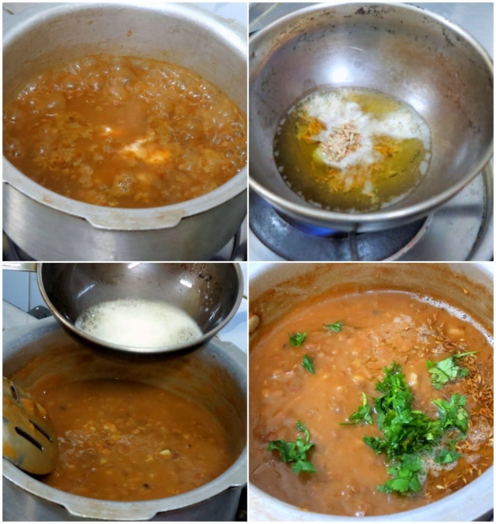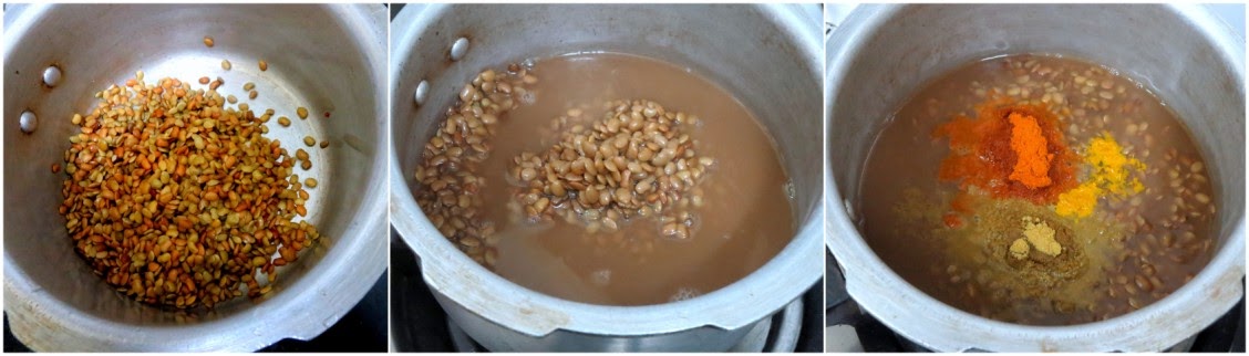 - Pressure cook the dal with enough water. Once the pressure falls down, add grated ginger, garlic, turmeric powder, salt, coriander powder, and chili powder.