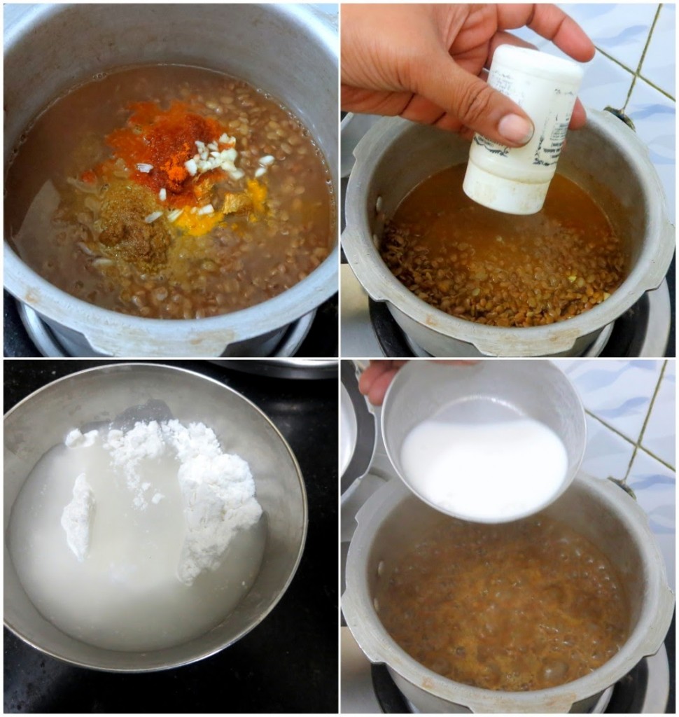 - Mix the rice flour with water to make a thick paste. Add to the cooking dal. Simmer for 5 - 7 mins.