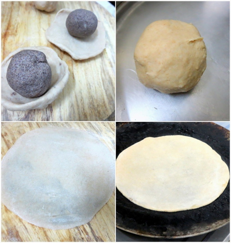 - Take a wheat dough, press on the sides with center being thick, place the mandua dough in the center, cover from all sides and seal it well.