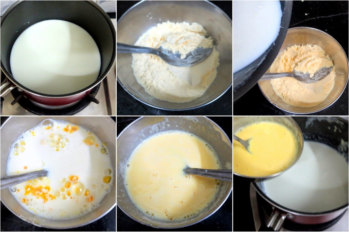 In a small cup of milk, mix the custard powder to get a lump free paste. Add sugar and cook. Add it back to the milk pan and bring to boil.