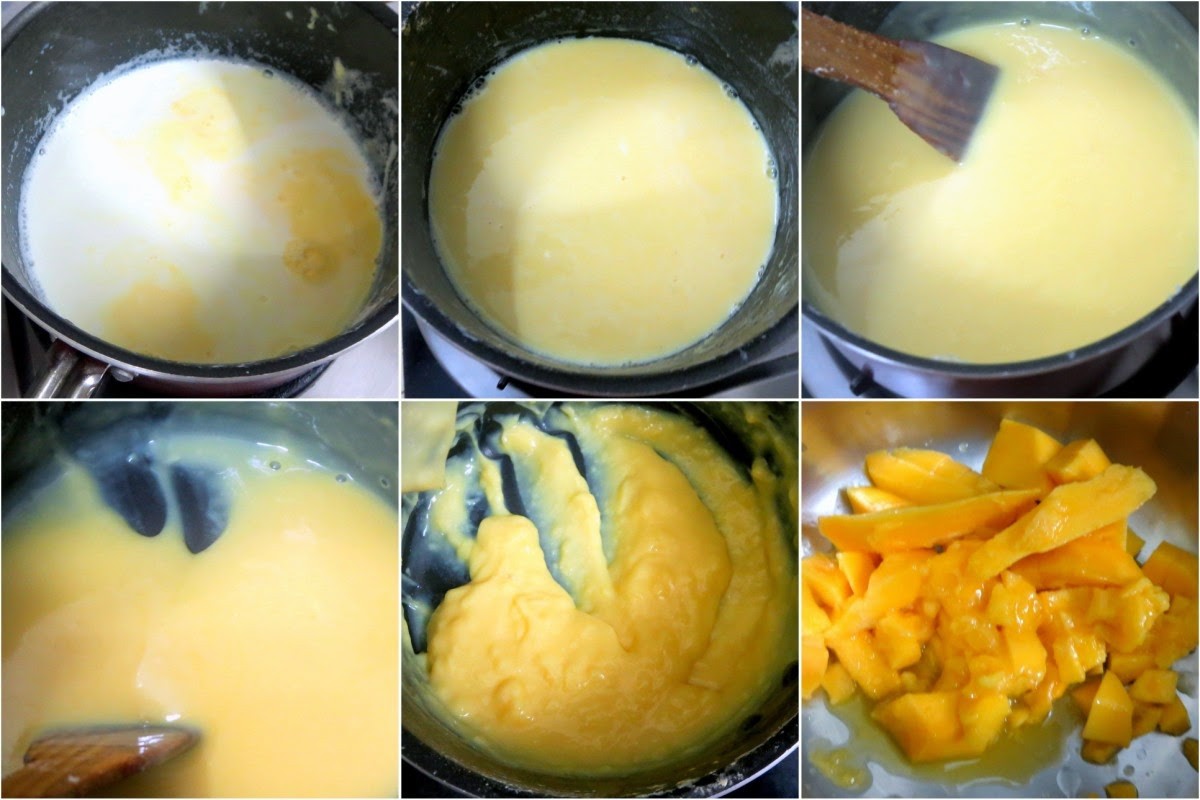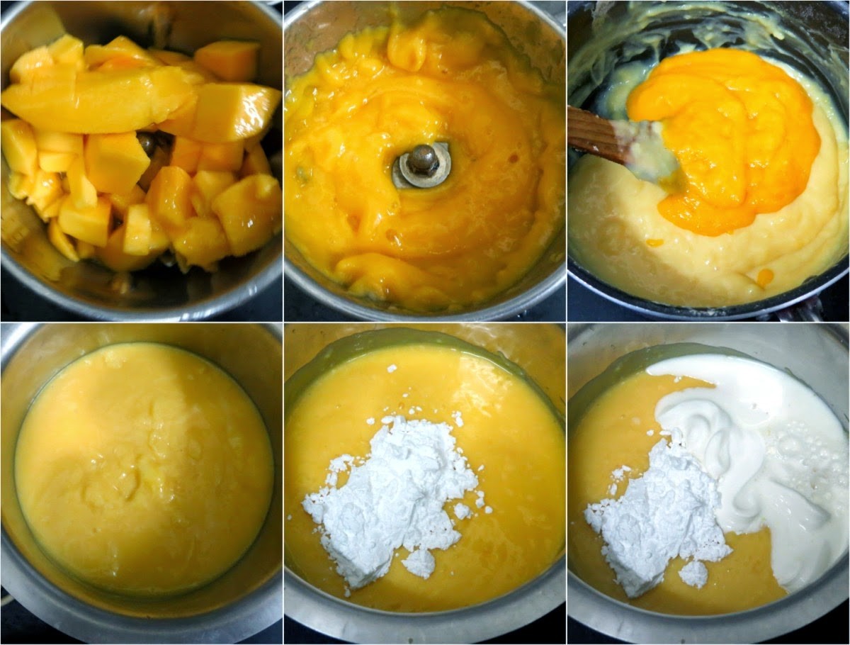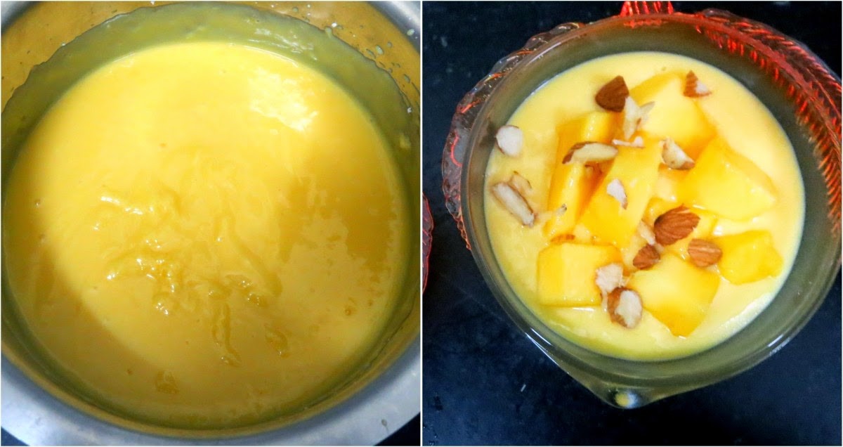 Meanwhile, make a puree of the ripe mangoes and mix it with the custard. Add icing sugar and cream and beat well.