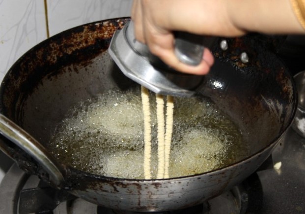 Once this is ready, immediately add the crushed murukus to the jaggary and mix well.