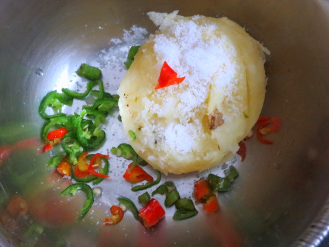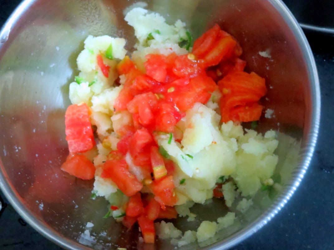 Finely chop the chilies, add to the potato along with mashed tomato. Mix everything well.