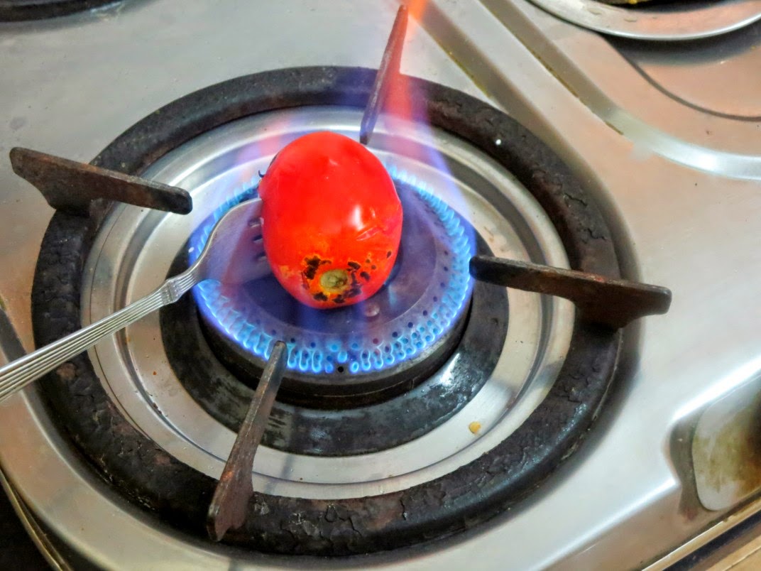 Meanwhile, apply the tomato with oil and burn it over the flame. Let it get cooked all over, till the skin starts peeling away. Continue for a couple of more minutes.