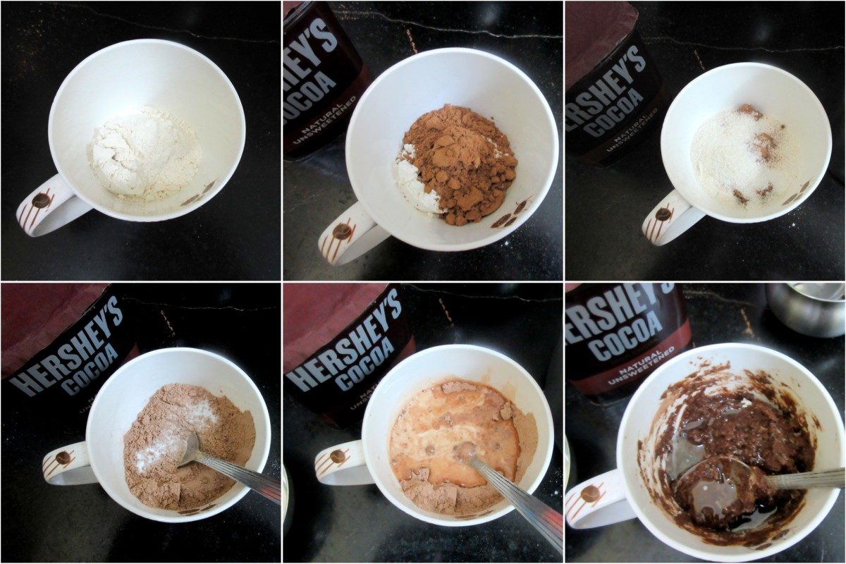 - In the Microwave Safe mug, take the flour, sugar, cocoa powder and Baking soda. Fluff together to mix everything properly.