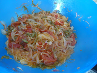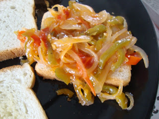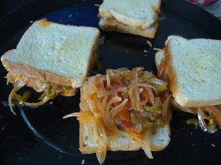 I made the stuffing with simple onions, tomatoes, and capsicum in the microwave. Grilled the bread in the grill mode.