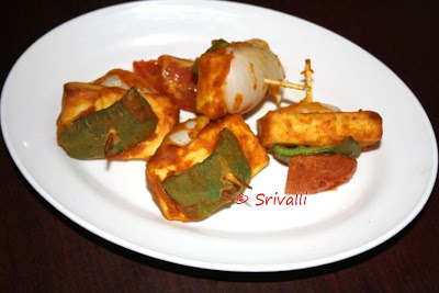 Then using toothpicks, insert the onions, capsicum, tomato with the paneer in between.