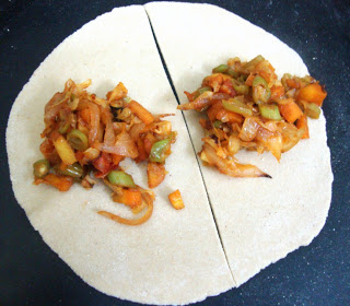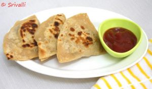 A few weeks ago while I was chatting with Amma, she showed me a Telugu magazine that talked about interesting tiffins for kids. I browsed through the pictures as I can't for the life of me read Telugu. Then had Amma read them for me. A couple of the paratha ideas were what I already make. The third one was called the Chinese style triangle paratha.