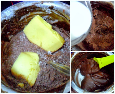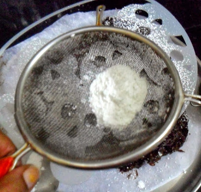 Sift the cocoa powder along with sugar in a thick bottom pan, add the butter and mix well.