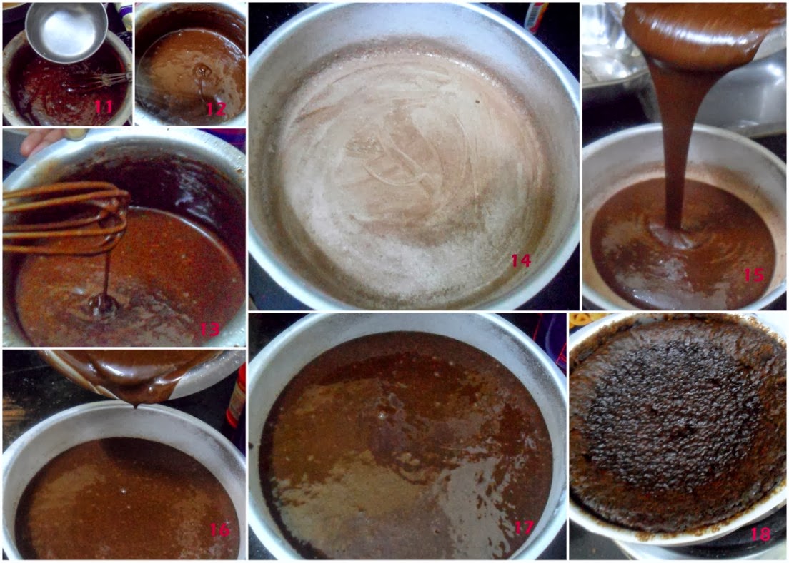 Sift the cocoa powder along with sugar in a thick bottom pan, add the butter and mix well.