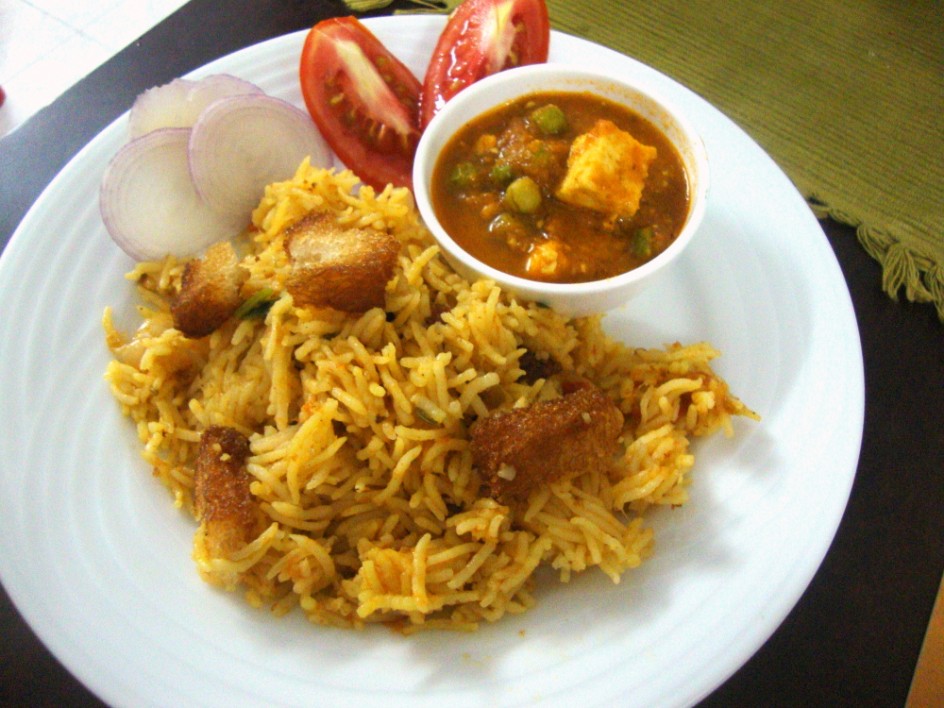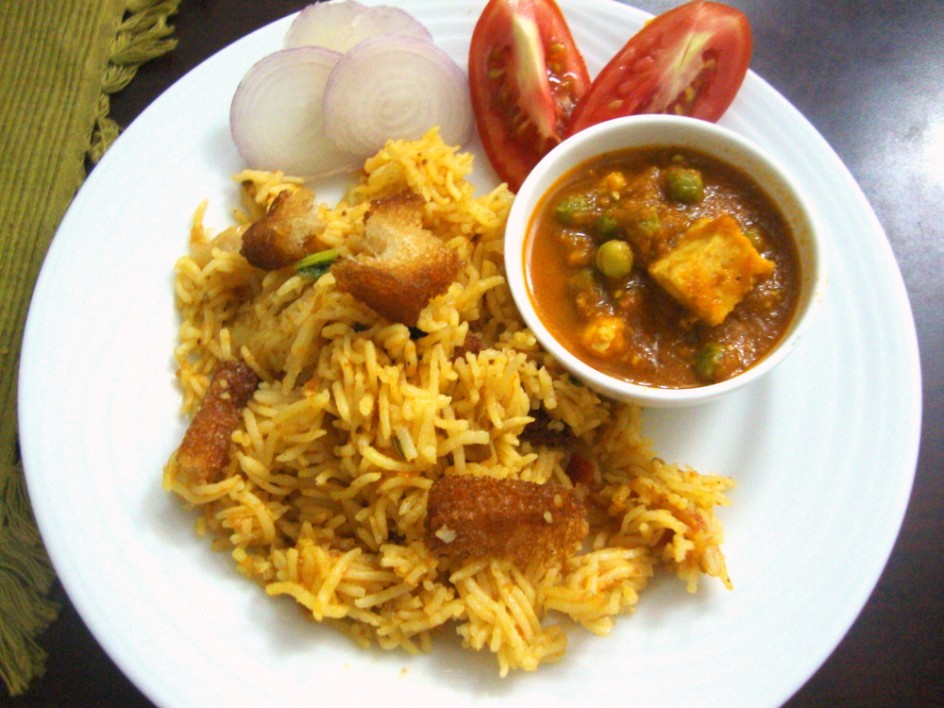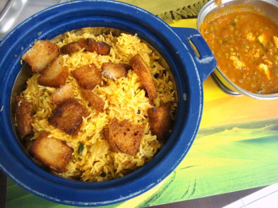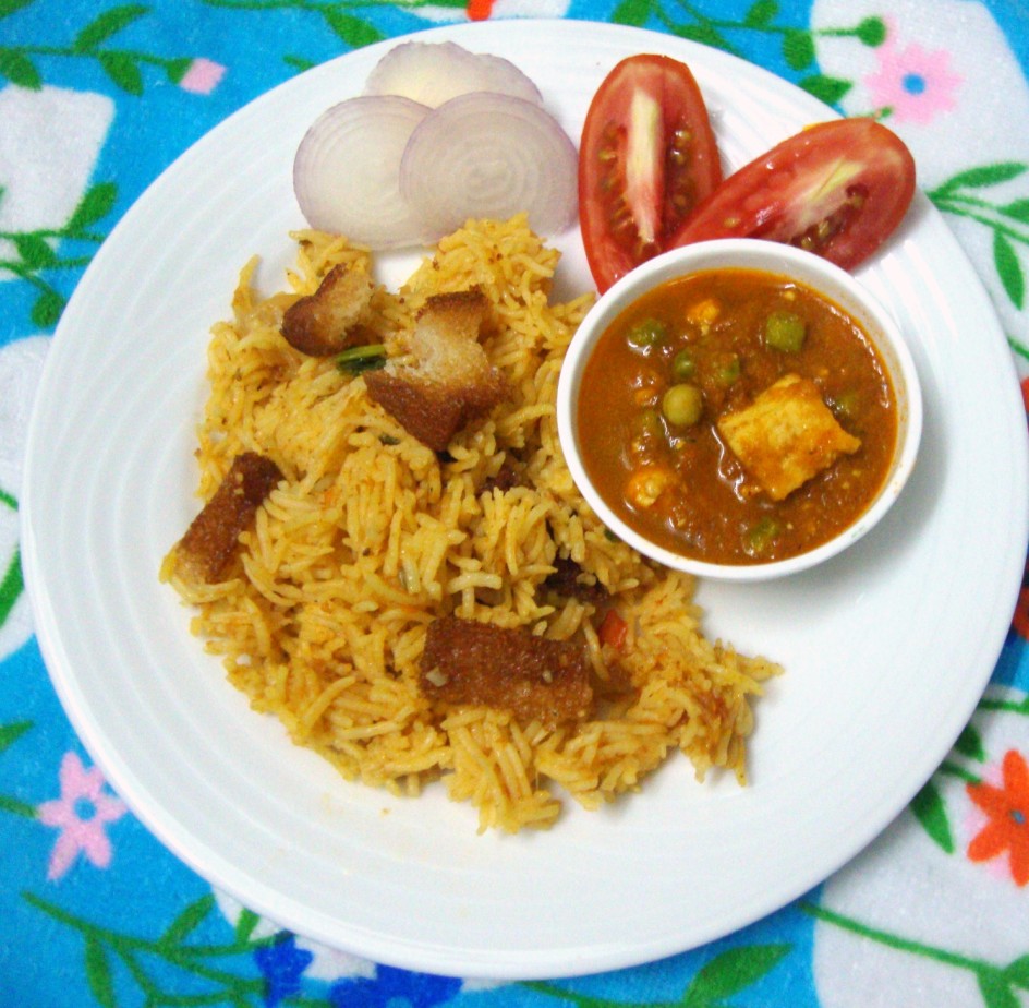 matar paneer simply looks delcious and tomato biryani...thats new to me but I love the addition of bread croutons in it. sounds so good