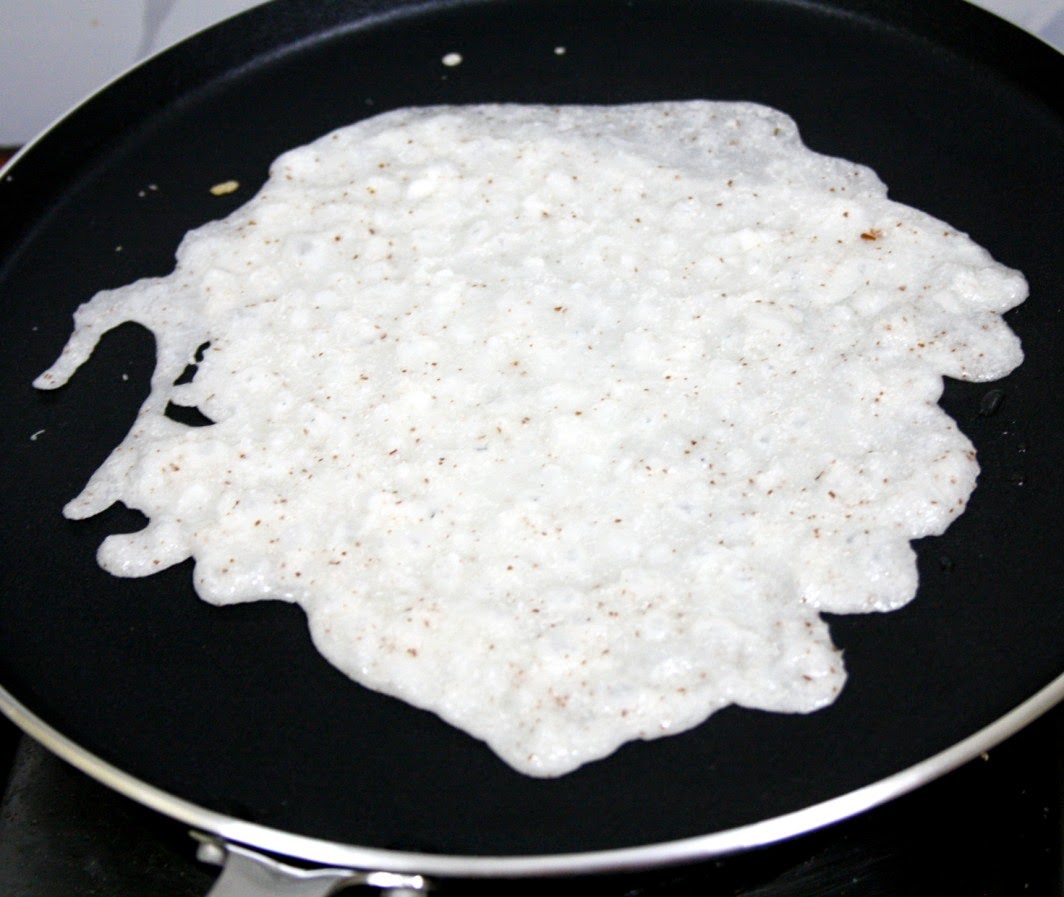 - Heat cooking oil in a tawa, pour some batter into it, and cover it.