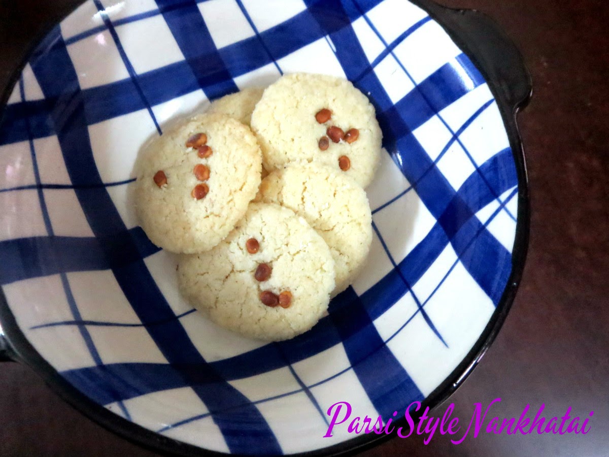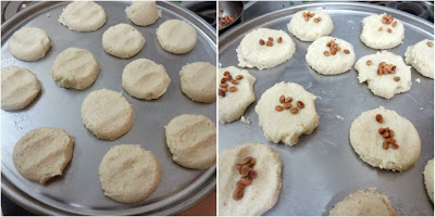 Pre heat the oven at 185 C and on a greased tray, pinch down small balls of dough. Flatten and press some chironji seeds on top.