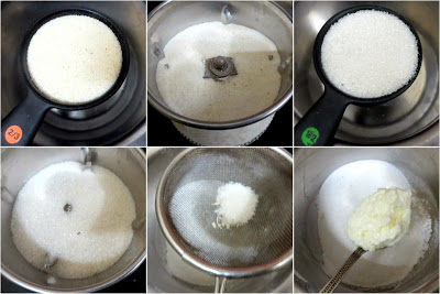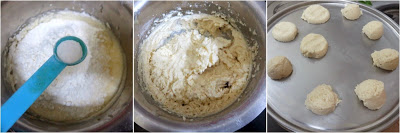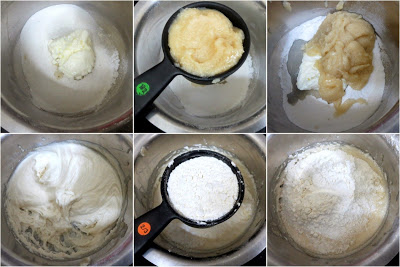 Powder granuated sugar with cardamom. Take it in a bowl and add curds, ghee and cream with a blender till it peaks. Then add flour, rava to the sugar mix and continue creaming.