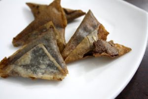 In a small bowl, mix the flour and water to make a smooth paste. Cut the spring roll wrappers, which will be square, into thin strips. Since mine were small squares, it was quite complicated to get the triangle shape.