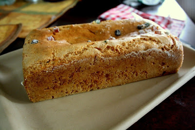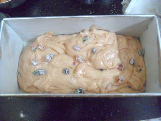 The batter will be quite thick and will drop off a spoon slowly. Transfer this batter to a loaf tin. Sprinkle the remaining tablespoon tutti frutti on top.