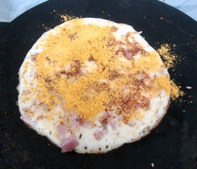 Flip it back to the original side. Sprinkle the podi/ spiced powder over the dosa, pour the ghee over it (the ghee should be hot for it to spread evenly)