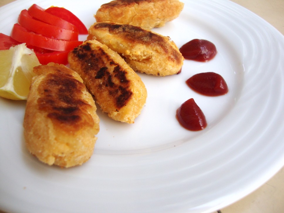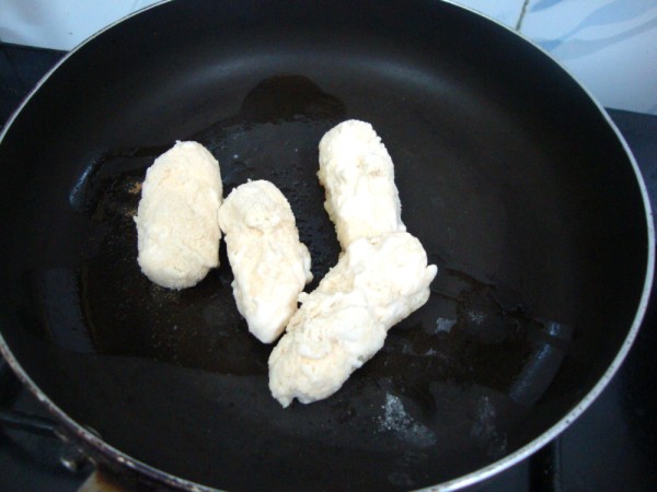 Dip the fingers in flour batter, roll over the bread crumbs. Pan fry in a non stick pan. Make sure it gets cooked to golden colour on all sides.