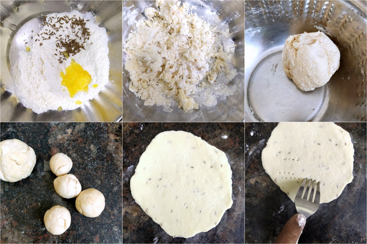 - In a bowl, take the flour along with ghee and cumin seeds.