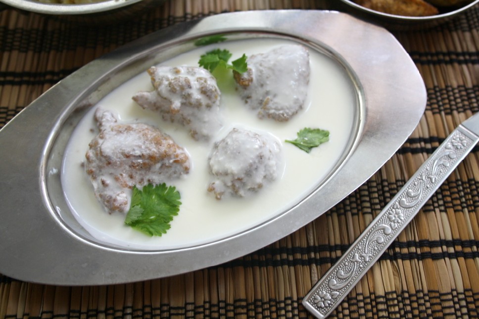 After you make the moong dal fritters, soak them in hot water. Blend the curds to a thick paste by beating it with salt and water. Drain the moong dal fritters and soak in the curds.