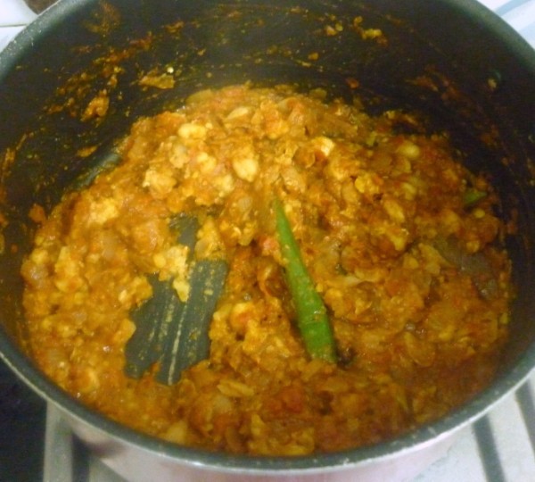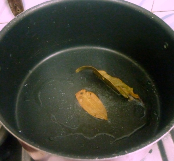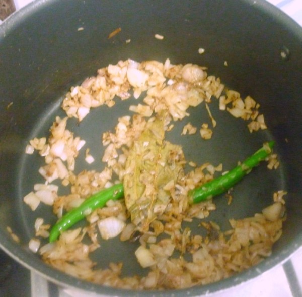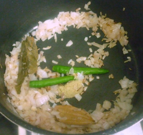 Heat oil in a non stick pan, add bay leaf and add finely chopped onion, sauté until golden brown in colour.