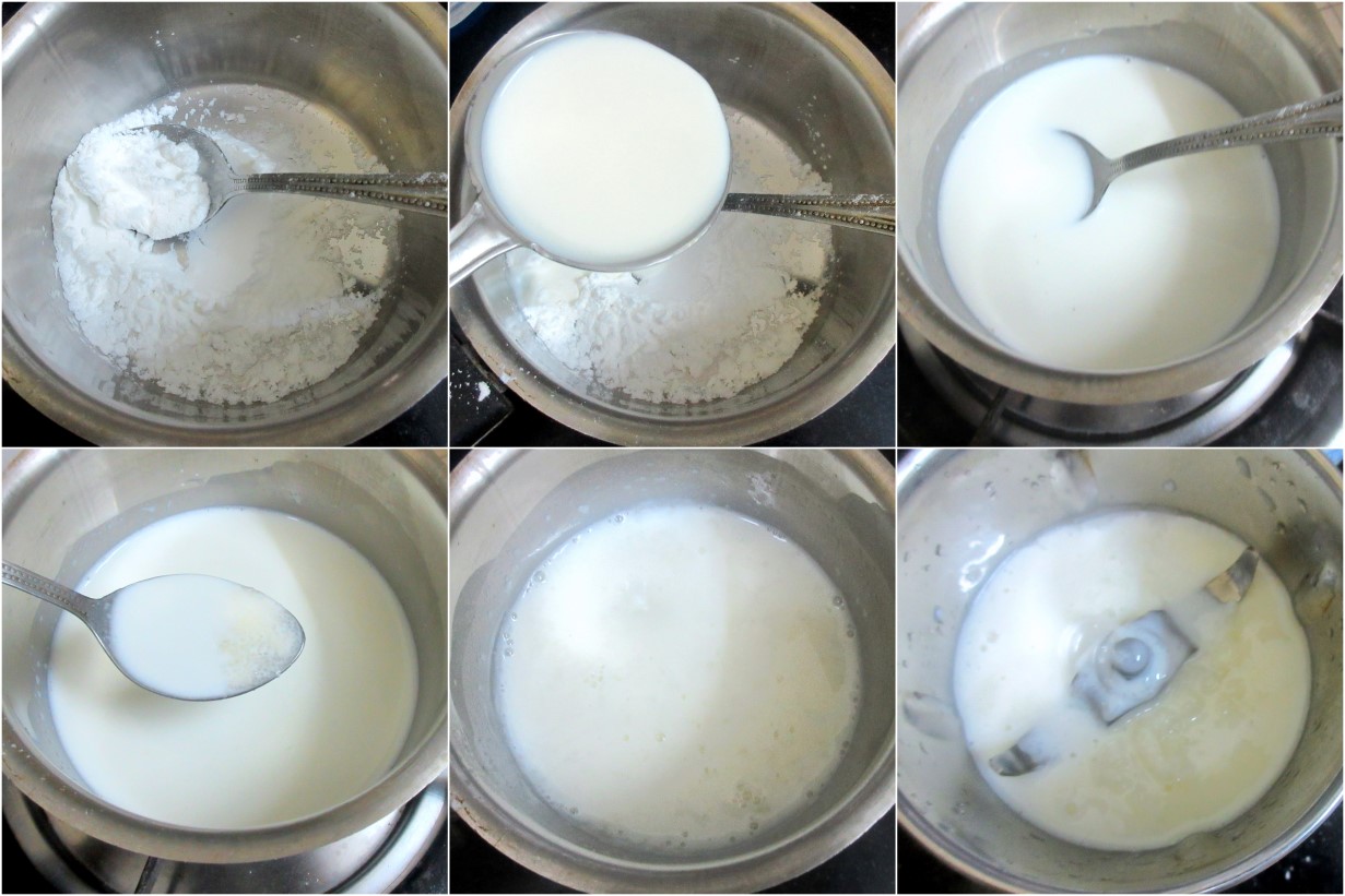 • In a saucepan, take the corn flour, add the milk and mix well. Cook on medium flame. After few seconds, add sugar and cook till the mix starts boiling. This takes about 2 to 3 mins. Allow it cool completely.