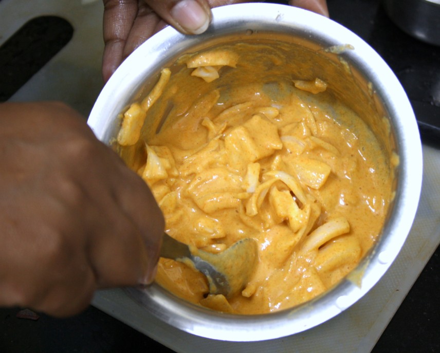 Make a paste with yogurt and besan, then mix with water to make a very thin batter.