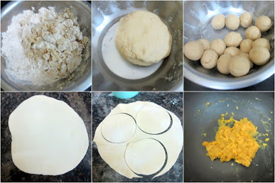 On the rolled out pooris, place a spoonful of stuffing and seal the other ends. You could try out different shapes used on Momos.
