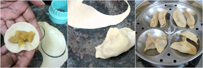 To quote her, "Qadbu is a sweet offered to palkhis - palkhis are Yatras of Ganapathi or Sai Baba which people travel with carrying the Lord in a palkhi on shoulders". Ok, I once again confirmed if the puran was the same as the Puran poli puran and if this has to be steamed. Also she said I could get creative with the shapes like momos.