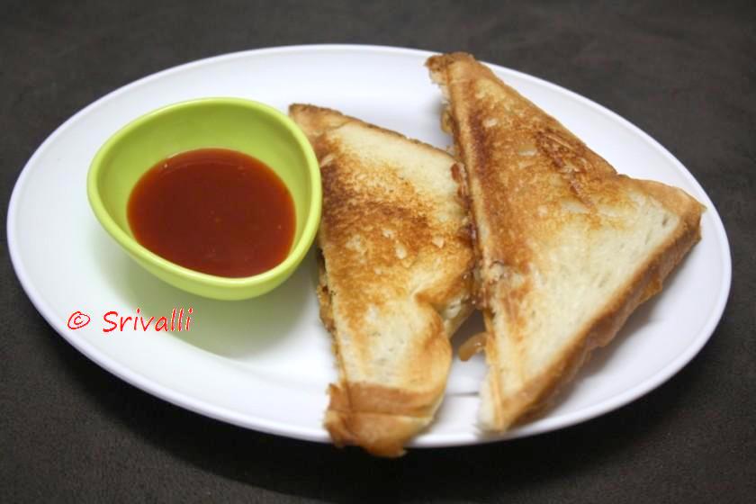 I made the tomato sauce for the spread for some, grated cheese. The other alternative fillings were curried potatoes, paneer, Plain cheese with green chilies, Cheese slices, Mixed Fruit Jam etc. Before I could even think of taking pictures, those disappeared. But I knew I would be making those again since Konda loves sandwiches.