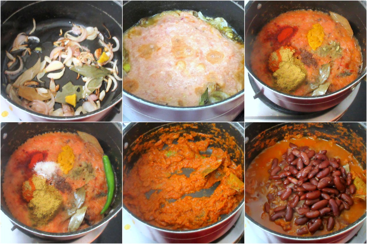 Soak the Rajma in plenty of water overnight. Change waters couple of times and pressure cook for 3 to 4 whistles or till it is softly cooked. Retain along with water aside.