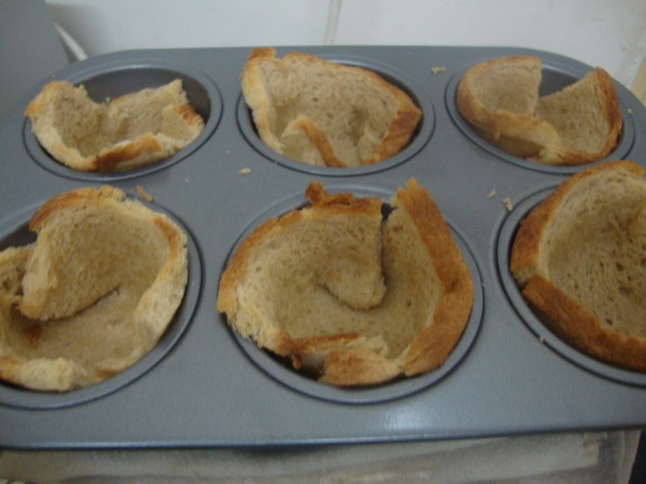 Trim the bread slices and press them down into the muffin holes. Ensure they cover the sides so as to form cups.